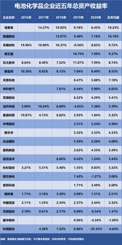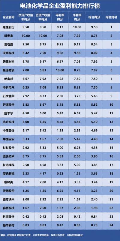 电池化学品企业盈利能力排行榜
