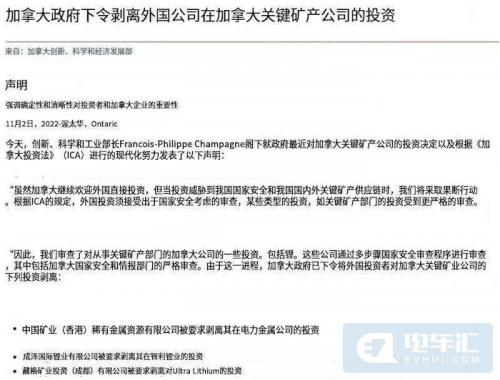 11月2日,加拿大相关部门以所谓国家安全为由,要求三家中国公司剥离其在加拿大关键矿产公司的投资。