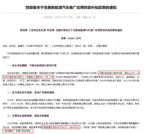 在2021年最后一天,财政部、工业和信息化部、科技部、发展改革委,四部委发布了《关于2022年新能源汽车推广应用财政补贴政策的通知》,通知要求2022年新能源汽车补贴标准在2021年基础上退坡30%;2022年新能源汽车购置补贴政策于2022年12月31日终止,2022年12月31日之后上牌的车辆不再给予补贴。