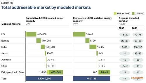 在澳大利亚,如下图所示,该报告显示,从2030年到2040年,长时储能的总潜在市场在20-40GW和0.5-1 TWh之间。