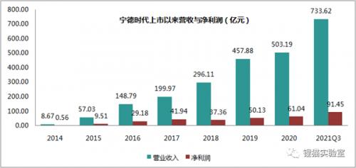 同时,宁德时代在一种比较严格的财务口径之下,仍然实现营收与利润的高速增长。截至2021年Q3,宁德时代的营收是2014年的85倍,净利润是2014年时的163倍。