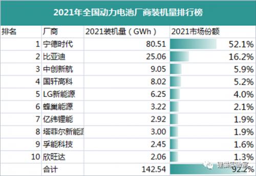 而在国内,宁德时代更是以52.1%的市场占有率一骑绝尘,甩开所有竞争对手,市占率是第二名比亚迪的3倍多,其他公司更是仅有其1/10及以下。