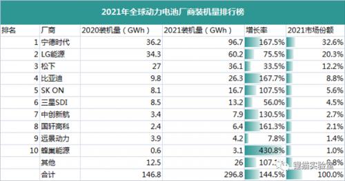 最新数据显示,2021年,宁德时代的装机量在全球已经稳居第一,且增速在前十名中仍然几乎并列第二。蜂巢能源在2021年的增速首屈一指,但其总体量还无法与宁王相提并论——差了接近两个数量级。
