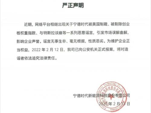2月13日,宁德时代试图终结这一历时弥久的负面疑云。当天,宁德时代公众号发布了一则“严正声明”,指出近期主要的三个传言均为恶意谣言,且公司已于前一日报案。