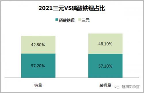 2021年全年,磷酸铁锂的销量已经达到106GWh,同比增长245%,占比57.2%,超越三元锂电池;装机量占比也已达到57.1%。