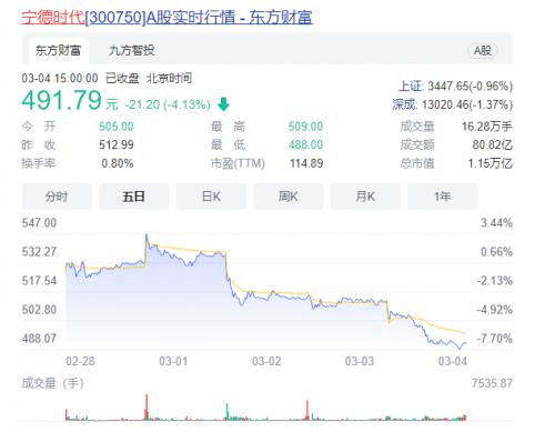 除了比亚迪外,同为新能源车产业链巨头的宁德时代也遭遇了大跌,再度跌破500元。截至3月4日收盘,报491.79元/股,跌幅达到为4.13%。