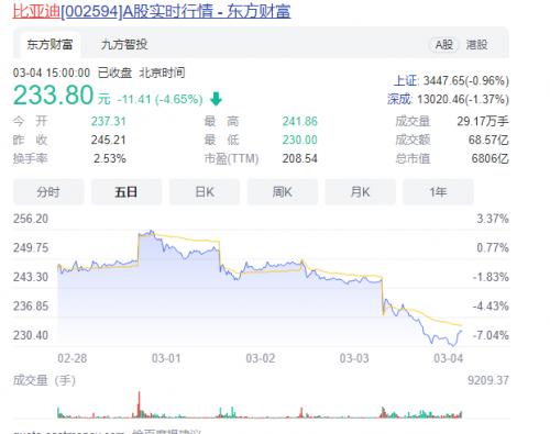 从本周一算起,比亚迪已经连续4天下滑,股价也从最高的256元跌至233元,一周之内市值缩水上百亿。