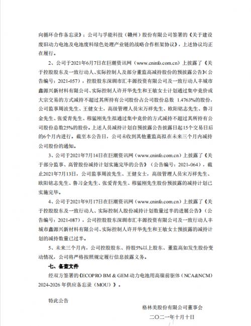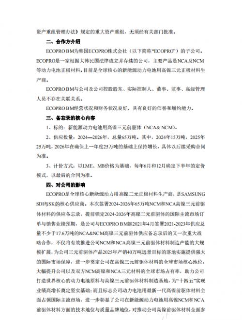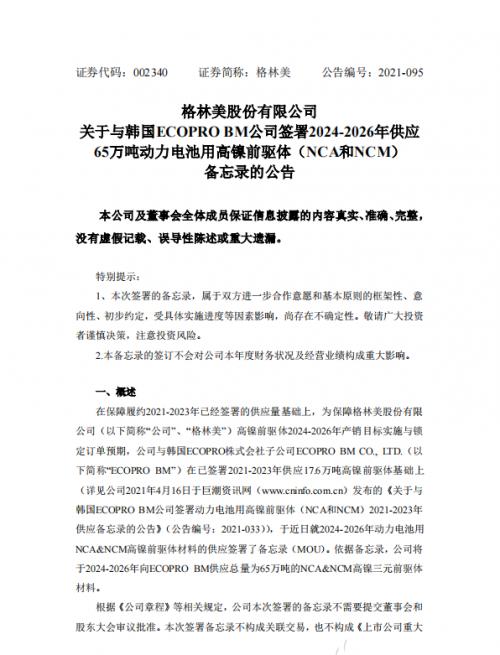 世纪储能网消息:10月10日,格林美发布公告称,公司与韩国ECOPRO株式会社子公司ECOPRO BM CO.,LTD.(以下简称“ECOPRO BM”)在已签署2021-2023年供应17.6万吨高镍前驱体基础上,就2024-2026年动力电池用NCA&NCM高镍前驱体材料的供应签署了备忘录(MOU)。依据备忘录,格林美将于2024-2026年向ECOPRO BM供应总量为65万吨的NCA&NCM高镍三元前驱体材料。据悉,ECOPRO是全球新能源动力电池用高镍三元正极材料核心生产商之一,若按此备忘录执行完成,格林美将提前锁定ECOPRO未来6年超80万吨高镍三元前驱体材料市场订单。