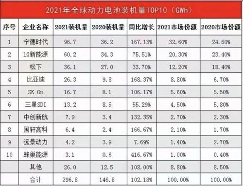 尽管相关情况未知,但有一点可以确定,在韩国市场研究机构SNE Research的数据中,2021年全球动力电池装机量的排名前十中,并没有发现美国电池厂商的身影。