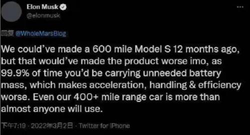 马斯克前不久在推特上表示,早在12个月之前,特斯拉就可以生产出续航600英里(965公里)的Model S,但这根本没必要,因为续航400英里(643公里)的Model S可以兼顾体验和效率的平衡。