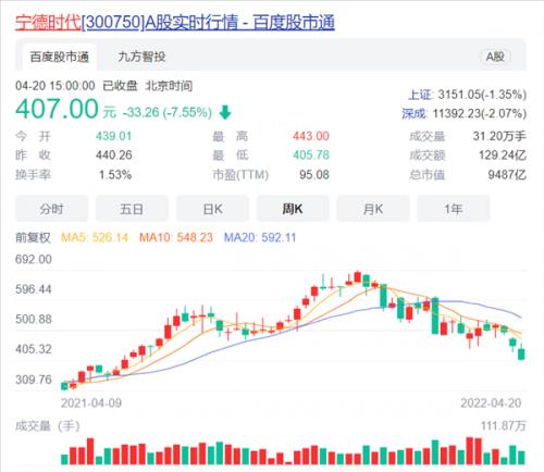 其中,今日收盘,宁德时代大跌7.55%,最新股价407元,创下今年新低,市值已跌破“万亿”关口,最新市值为9487亿元。