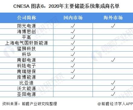 根据CNESA的统计,2020年,新增电化学储能项目储能系统集成主要提供商(按装机规模)包括阳光电源、海博思创、平高等;其中,阳光电源、南都电源在国内与海外的装机规模均排名前列。