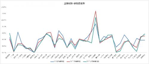 国民技术因集成电路和负极材料业务同时迎来高增长,录得3392.96%的利润增幅,其研发费用率也因为集成电路的带动高达20%-30%,远高于负极材料领域的其他公司。