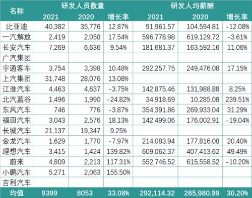 平均每家企业的研发人员数量为9299人,高出电池环节,同时比亚迪、上汽集团、长城汽车的研发团队突破万人。其中,“蔚小理”研发团队增长最为迅猛,团队人数较前一年均已翻倍。