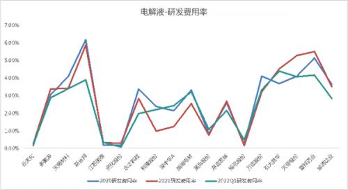 2020-2022Q1电解液行业的平均研发费用率分别为2.74%、2.59%和2.39%,呈现小幅下降趋势。