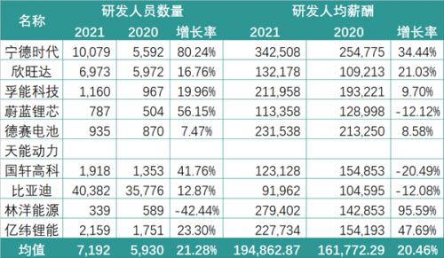 而从研发人员数量来看,宁德时代的研发团队扩张增速更是高达80.24%。