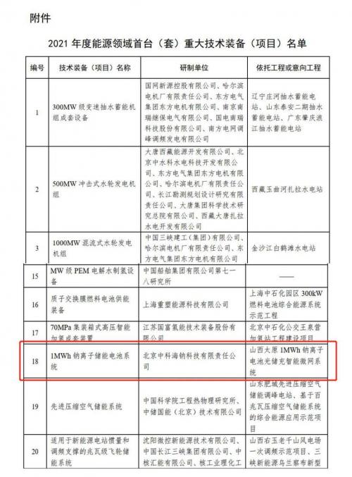 5月13日,国家能源局公布了2021年度能源领域首台(套)重大技术装备(项目)名单,包括75项技术装备,其中储能领域涉及8个技术装备(项目),氢能涉及4个。中科海钠研发并于2021年6月28日投运的1MWh钠离子储能电池系统成功入选。