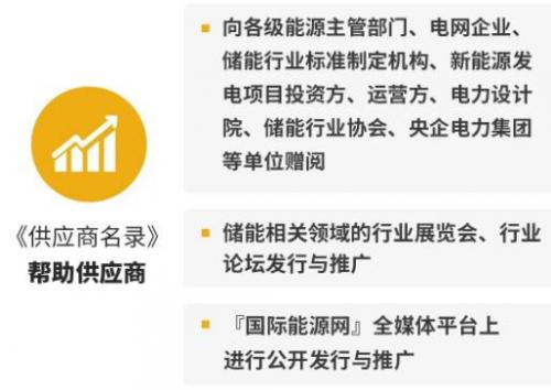 届时,编印成册的《供应商名录》将向各级能源主管部门、电网企业、储能行业标准制定机构、新能源发电项目投资方、运营方、电力设计院、储能行业协会、央企电力集团等单位赠阅,并在储能相关领域的行业展览会、行业论坛、以及『国际能源网』全媒体平台上进行公开发行与推广。
