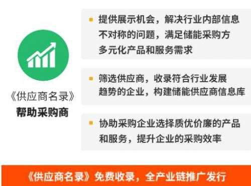 《供应商名录》主要是帮助采购商从源头把控质量、优化成本、增加采购的筛选范围,提升企业的采购效率,助力行业应用质量可靠、价格优惠、服务优质的储能行业装备、产品和解决方案。