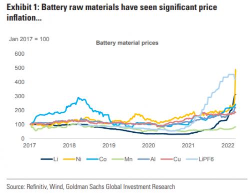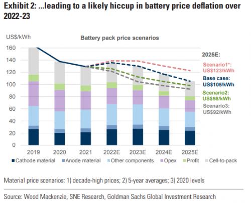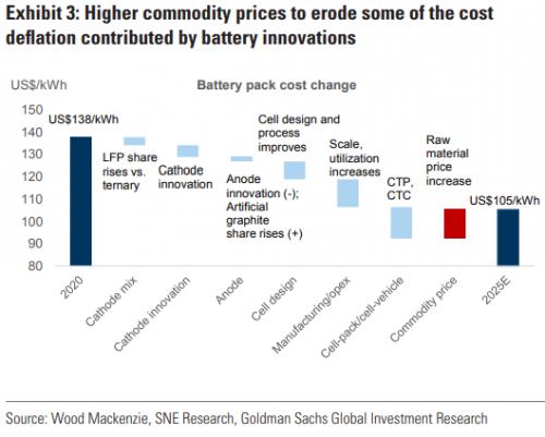 高盛电池价格模型指出,对电池价格在未来十年持续下降的长期共识发出挑战的是原材料价格的上涨。
