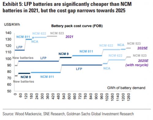 当考虑电池的回收价值,LFP的成本优势将受到较低的回收价值影响,优势可能会缩小。
