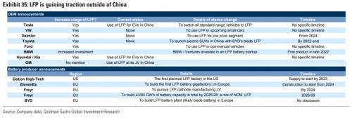 在中国,LFP从去年9⽉开始超越三元电池成为No.1电池类型;在中国以外,LFP的使用也正在加快,这是因为2022-23年左右的专利到期取消了之前在中国以外的使⽤限制。鉴于LFP的成本优势和OEM的材料多样化激励措施,高盛现在预计LFP的市场份额将上升到2030年,从25%提⾼到2030年的38%。