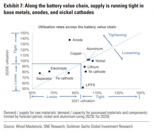 在电池组件中,高盛看到负极和镍正极的供应受到更多限制。虽然镍正极供应商已宣布充分扩张以缓解到2025年的供应紧张,但迄今为⽌宣布的负极产能扩张未能满⾜需求增⻓,这意味着在吸引更多投资之前,将保持高边际利润。