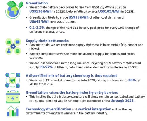 高盛发布的《Global Batteries: The Greenflation Challenge》称,电池制造是一项复杂的业务,需要确保各种原材料和管理各种组件的供应链,尤其这些组件会随着化学体系的发展而变化。而今,不断增长的需求、零部件短缺和不断上涨的原材料价格正对挑战未来十年电池价格持续下降的固有认知。为了评估这种“绿色通胀”的影响和未来潜在的供应链平静,高盛引入其专有的电池价格、成本曲线模型、各种组件的供需模型和熊市电池TAM预测。