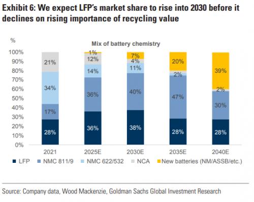由于LFP与NCM相⽐,LFP的能量密度较低,高盛认为LFP将在⼩型电动汽⻋上大量使用。随着电池回收市场向2030年迈进,LFP的市场份额将在2030年后开始萎缩,其成本竞争力因回收价值低于NCM ⽽降低,让位于NCM811/9和其他新电池的扩张。
