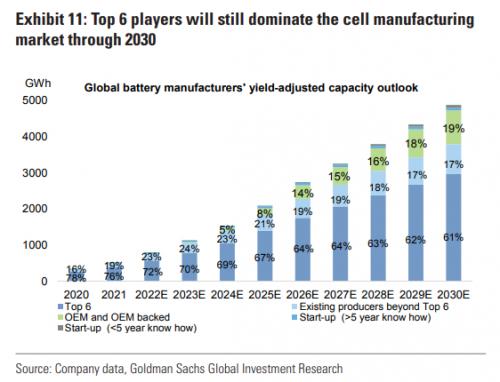 尽管许多新的初创企业正在争夺电池制造的市场份额,但高盛认为头部企业在2022-30年保持领先地位的⻛险并不⼤。新进⼊者存在多重障碍,包括现有头部企业的技术领先地位、规模经济,以及垂直整合,这种竞争优势实现了对供应链的完全控制,在原材料供应瓶颈⾯前变得更加突出。预计未来⼗年⾮ OEM ⽀持的初创企业仅占全球供应量的2-3%,并且该行业将保持整合。