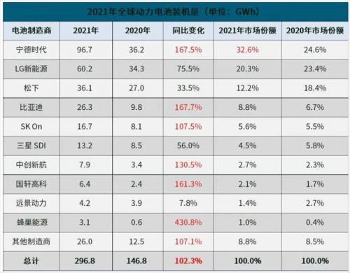 截至2021年,宁德时代已经连续五年“霸占”全球最大动力电池企业的宝座。2021年装机量达到96.7GWh,同比增加了167.5%,全球市场份额也进一步增长,从2020年的24.6%增长到了32.6%。