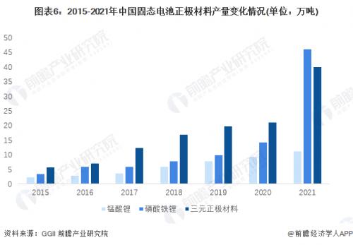 固态电池正极材料主要包括锰酸锂、磷酸铁锂,三元正极材料,近年产量均呈现稳步增长态势,2021年产量分别达到11.11万吨、45.91万吨、39.8万吨。