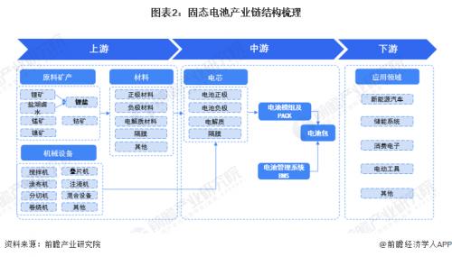 固态电池产业链与液态锂电池大致相似,上游包括原料矿产、机械设备以及基础材料,两者主要的区别在于负极材料和电解质的种类,正极材料方面几乎一致,若完全发展至全固态电池,隔膜也完全被替换。产业链中游为电池包的加工制备过程,产业链下游应用领域包括新能源汽车、储能系统、消费电子等。