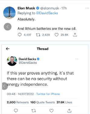 马斯克在该条推文下回复称,“绝对的。锂电池就是新的石油。”