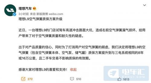 理想官方回应,出于对产品质量的信心,同时为了打消用户对空气弹簧的顾虑,理想汽车决定将理想L9的空气弹簧(包含空气弹簧本体、空气泵、储气罐)质保方案提升到与三电系统相同的8年或16万公里,且二手车交易不影响质保的有效期。