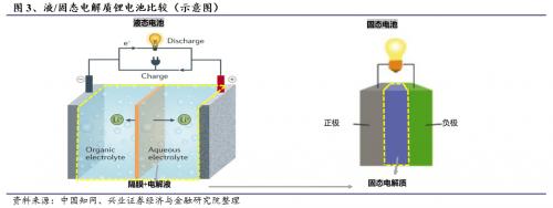 目前使用的锂离子电池内部的正负极由液态的电解质连通,而固态电池则是减少乃至不使用电解液,直接用固态的复合材料进行连接。