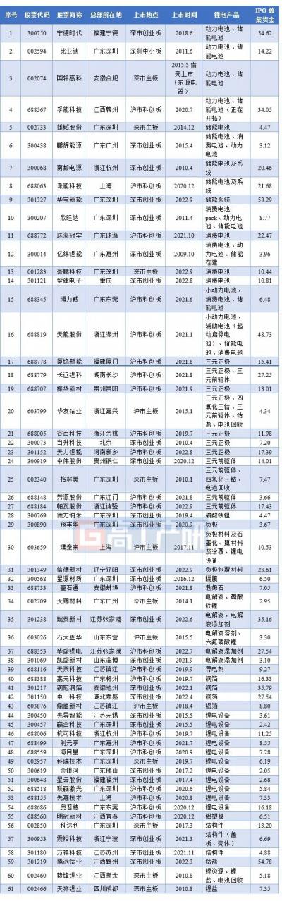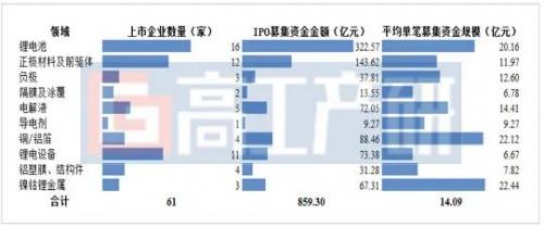 61家锂电上市企业IPO募集资金合计859.30亿元