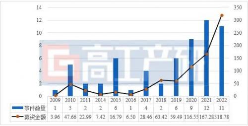 2009-2022年新股发行成功企业数量及IPO募集资金总规模(单位:起,亿元)