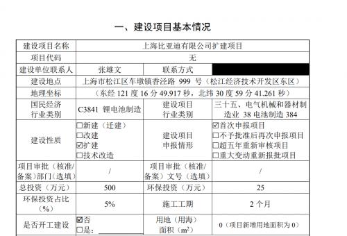 10月11日消息,10月9日上海企事业单位环境信息公开平台网站显示,为满足市场需求和公司自身的发展,比亚迪拟投资500万元建设上海比亚迪有限公司扩建项目。公开信息显示,上海比亚迪有限公司现有厂区位于上海市松江区,主要从事锂电池、太阳能电池组件等电子元件制造以及有色金属复合材料、新型合金材料加工等。