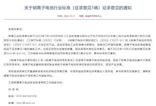 10月11日,中国电子技术标准化研究院发布《关于钠离子电池行业标准(征求意见1稿)征求意见的通知》指出,钠离子电池标准起草组完成了征求意见1稿的编制工作。