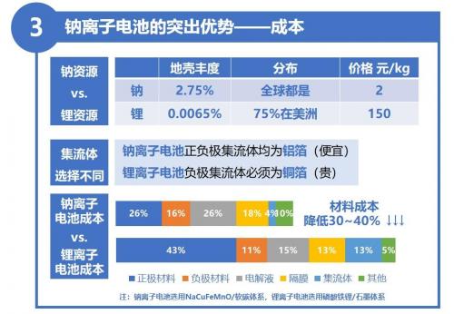 根据中科海钠官网信息,在材料成本方面,钠离子电池会比锂离子电池降低30~40%;并且,按照目前水平,钠电池的寿命虽然没有锂电池长,但足以打败铅酸电池。