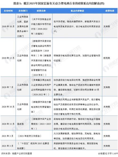 自2004年以来,我国发布的多项锂电池和新能源汽车的相关政策及规划加快推动了我国动力锂电池的发展,如《新能源汽车产业发展规划(2021―2035年)》明确提到实施电池技术突破行动;推动动力电池全价值链发展,建设动力电池高效循环利用体系;加快推动动力电池回收利用立法等规划。