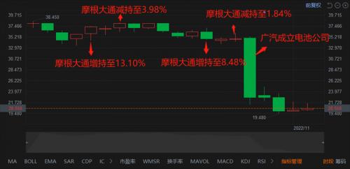 然而这并没有直接影响股价,减持前后中创新航股价依然在34港元左右徘徊,但到了10月27日(摩根大通减持的第二天),中创新航最大的客户广汽埃安宣布自己做电池,中创新航股价才重挫35%,收跌21.3港元。