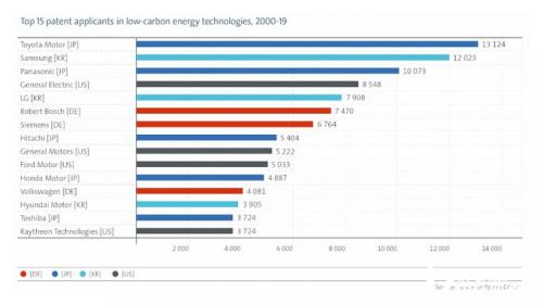 图表标题:2000-2019年,清洁能源技术国际专利族的国家来源