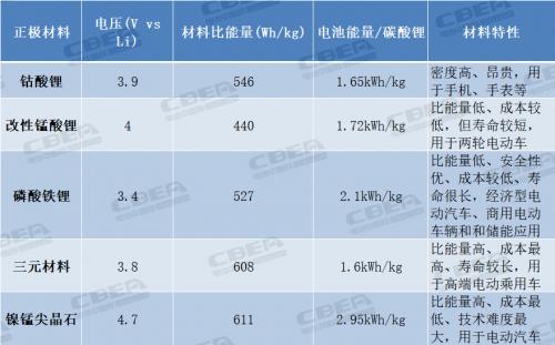各种正极材料性能及成本对比