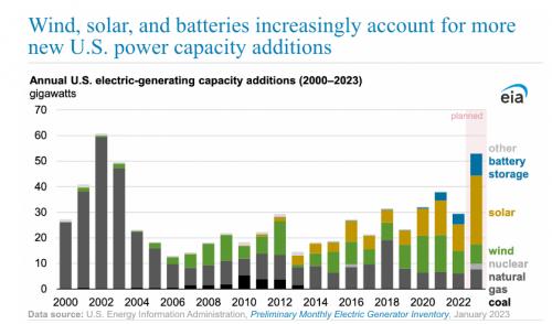 据美国能源信息署的数据,2023年美国风力、太阳能和电池储能将占开发商计划上线的新的公用事业规模发电装机容量的82%。