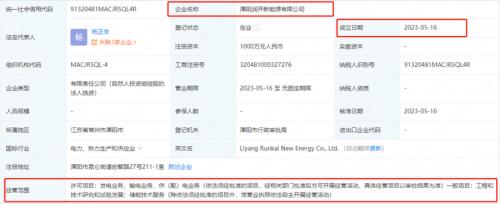 来自企查查的消息显示,5月16日,溧阳润开新能源有限公司(简称“润开新能源”)正式成立,该公司法定代表人为杨正举,注册资本为1000万元人民币。