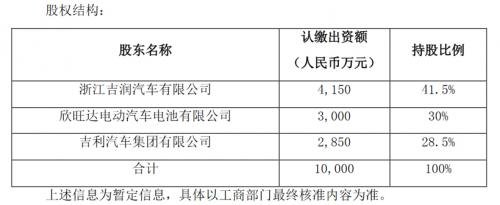 公告显示,山东吉利欣旺达注册资本为人民币10,000万元,由吉润汽车、欣旺达及吉利汽车集团以货币形式出资,三方拟认缴出资金额分别为4150万元、3000万元、2850万元,持股比例分别为41.50%、30%、28.50%。