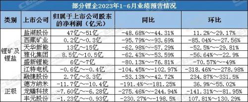 相关企业业绩预告信息显示,今年1-6月锂矿、锂盐和正极材料企业业绩普遍不及预期。