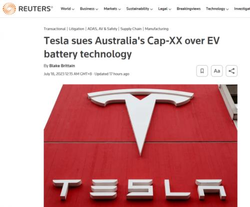7月14日,特斯拉于德克萨斯联邦法院对澳大利亚公司Cap-XX提起专利诉讼。特斯拉称Cap-XX的一款超级电容器侵犯了特斯拉旗下Maxwell Technologies拥有的两项美国专利。